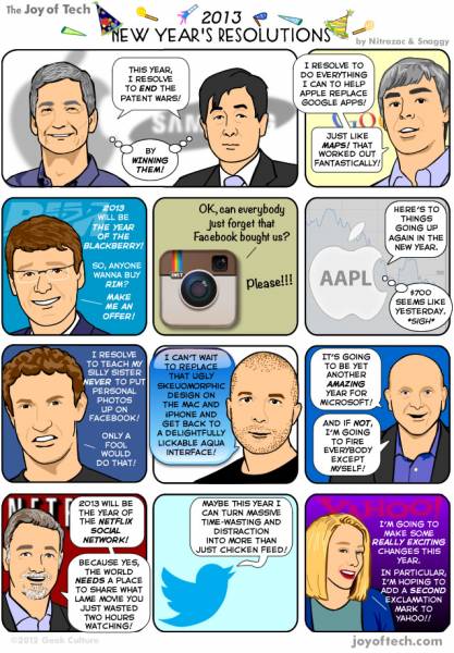 Pronašao sam sliku ispod koja, na neki način, pokazuje koje su novogodišnje odluke ljudi iz IT sveta. Tu se nalaze Tim Cook, Mark Zuckerberg, Instagram, Twitter, Steve Ballmer i ostali. Ima sarkazma, i to baš dosta, ali iskreno rečeno moraju da se reše neke stvari koje su opisane na slici ispod. Samsung i Apple moraju da reše pitanje tužbi, Facebook mora imati bolju privatnost, a RIM bi trebalo da se podigne na noge ove godine, koliko toliko.
